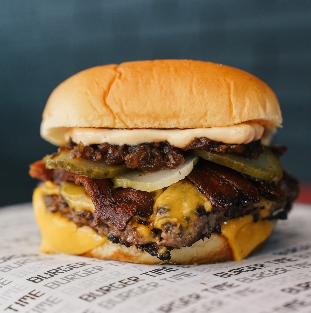 Pan Martins, queso cheddar, manteca saborizada, bacon, pepinillos, cebolla caramelizada, salsa shack.